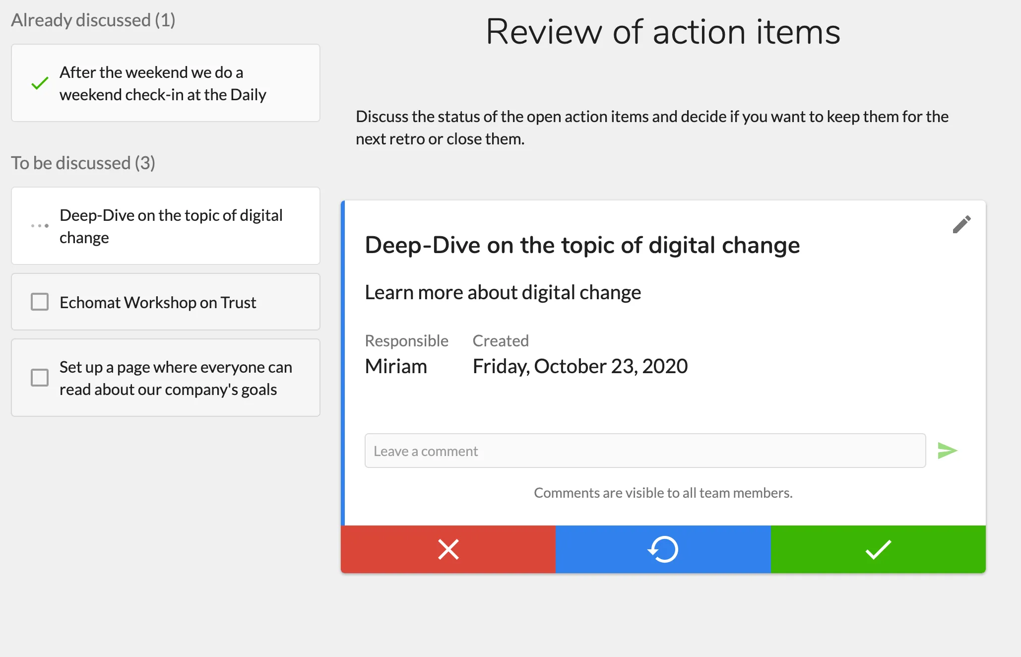 The discussions remain structured and don’t get out of hand. With Echometer, the retros follow a common thread. In this way, it is possible to steer the discussions better and lead them back to the core if you digress a little. Because of this, I also no longer felt the dissatisfaction can arise when team members were of the opinion that something was not being discussed properly.